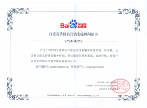 鹽城思科網(wǎng)絡(luò)工程有限公司作為百度鹽城地區(qū)總分銷商,在2007年度參加百度競(jìng)價(jià)排名服務(wù)資質(zhì)考核中,經(jīng)過(guò)公司全體員工們的共同努力,再創(chuàng)佳績(jī),其中通過(guò)中級(jí)服務(wù)認(rèn)證考核8人,3人優(yōu)秀,通過(guò)率達(dá)95%,被全球最大中文搜索引擎——百度在線(北京)有限公司再次授權(quán)百度競(jìng)價(jià)排名鹽城地區(qū)唯一客戶服務(wù)中心。盡善盡美的售后、全心全意的服務(wù),思科人將用十二分的熱忱等待您的惠顧,共創(chuàng)新紀(jì)元!