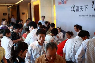 在四月底,我們公司召開了“百度營銷中國行動(dòng)員大會(huì)”,給每位員工做好思想動(dòng)員,希望每位員工在思想上重視這次會(huì)議,通過大家的努力保證會(huì)議的順利召開,最終完美呈現(xiàn)給廣大客戶。會(huì)前一個(gè)月我們在鹽城分眾傳媒投放了關(guān)于營銷中國行的宣傳報(bào)道片,在一個(gè)月的時(shí)間內(nèi)滾動(dòng)循環(huán)播出,同時(shí)在鹽城晚報(bào)半版的形式進(jìn)行中國行活動(dòng)的宣傳,通過鋪天蓋地的宣傳報(bào)道給客戶帶來視覺與聽覺的沖擊,把百度中國行的信息席卷鹽城大地,傳達(dá)給鹽城地區(qū)所有企業(yè)客戶。在公司五月初把活動(dòng)日程安排公布以后,市場部開始著手準(zhǔn)備活動(dòng)地點(diǎn)、活動(dòng)的具體流程、活動(dòng)各項(xiàng)物料準(zhǔn)備等,而商務(wù)部則是在活動(dòng)前半個(gè)多月就開始客戶的邀約。重點(diǎn)在邀約客戶這方面,為了保證會(huì)議現(xiàn)場客戶的數(shù)量與質(zhì)量度,我們要求每位商務(wù)人員對于每位客戶首先通過多次電話形式進(jìn)行溝通,然后以傳真回執(zhí)和送達(dá)邀請函的方式確認(rèn)到場情況。